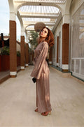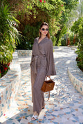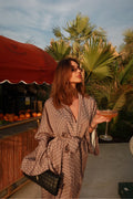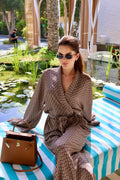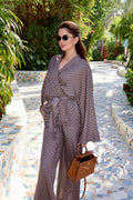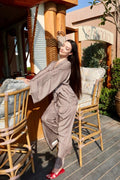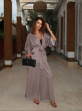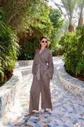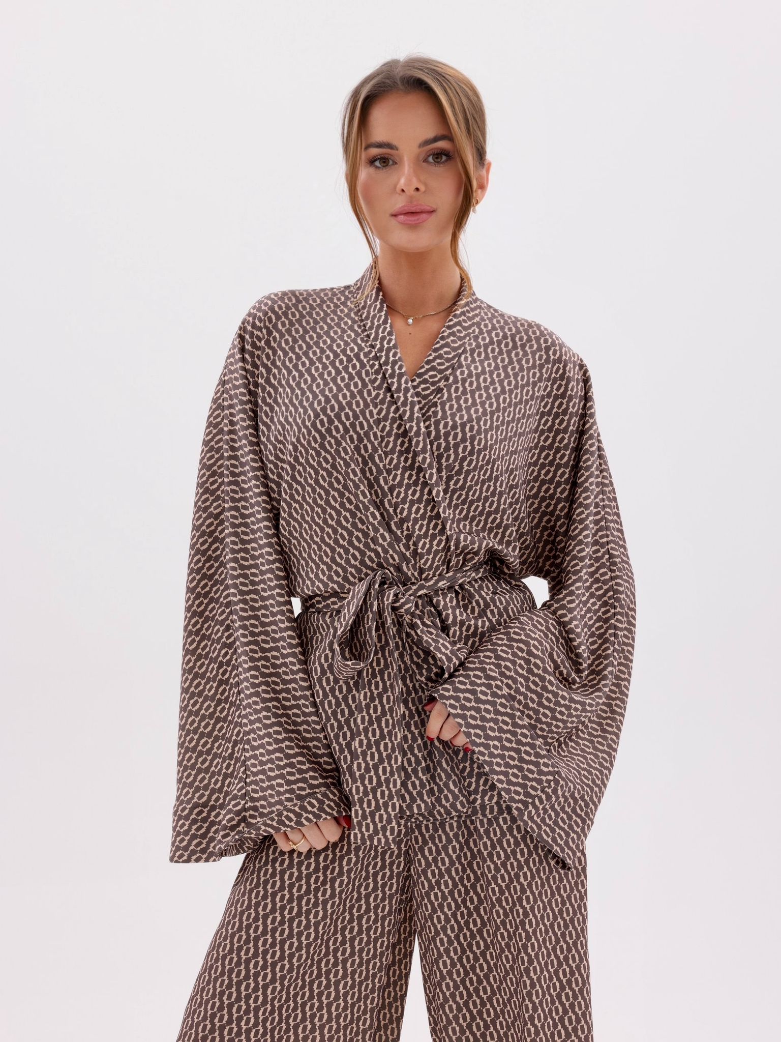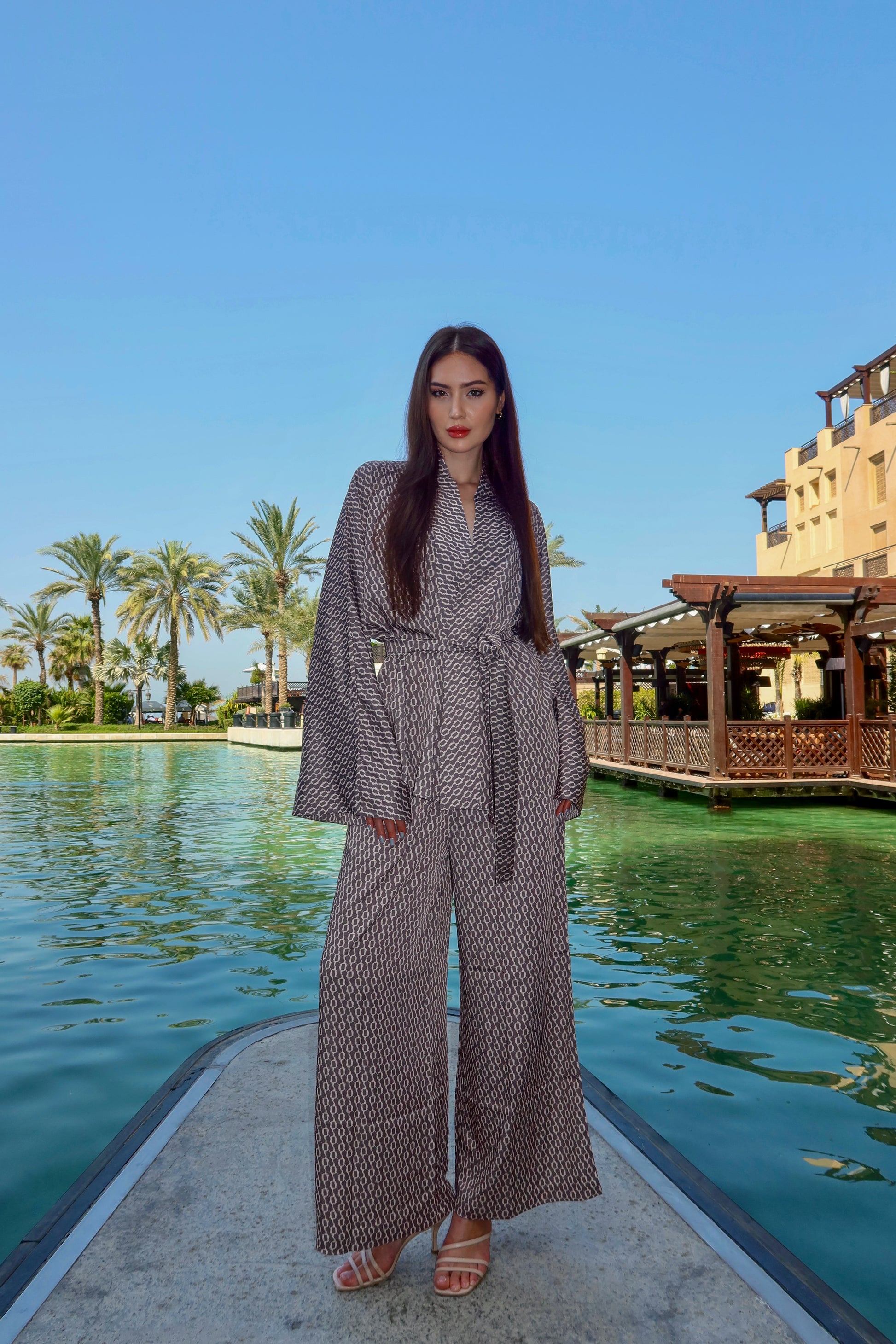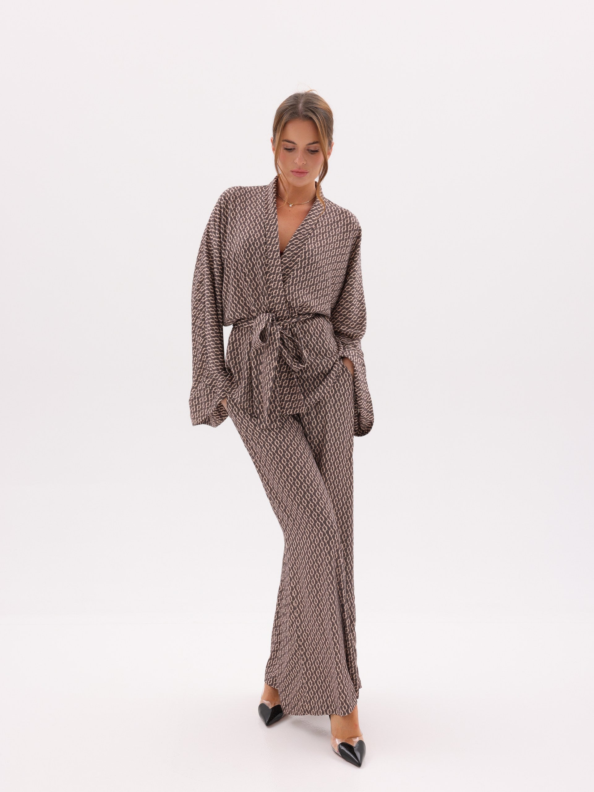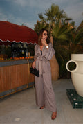 Crafted from lightweight luxury fabric with a fluid drape, the Noelle features a flattering wrap top with dramatic sleeves and an adjustable tie waist, paired with high-waisted wide-leg trousers that elongate the silhouette.